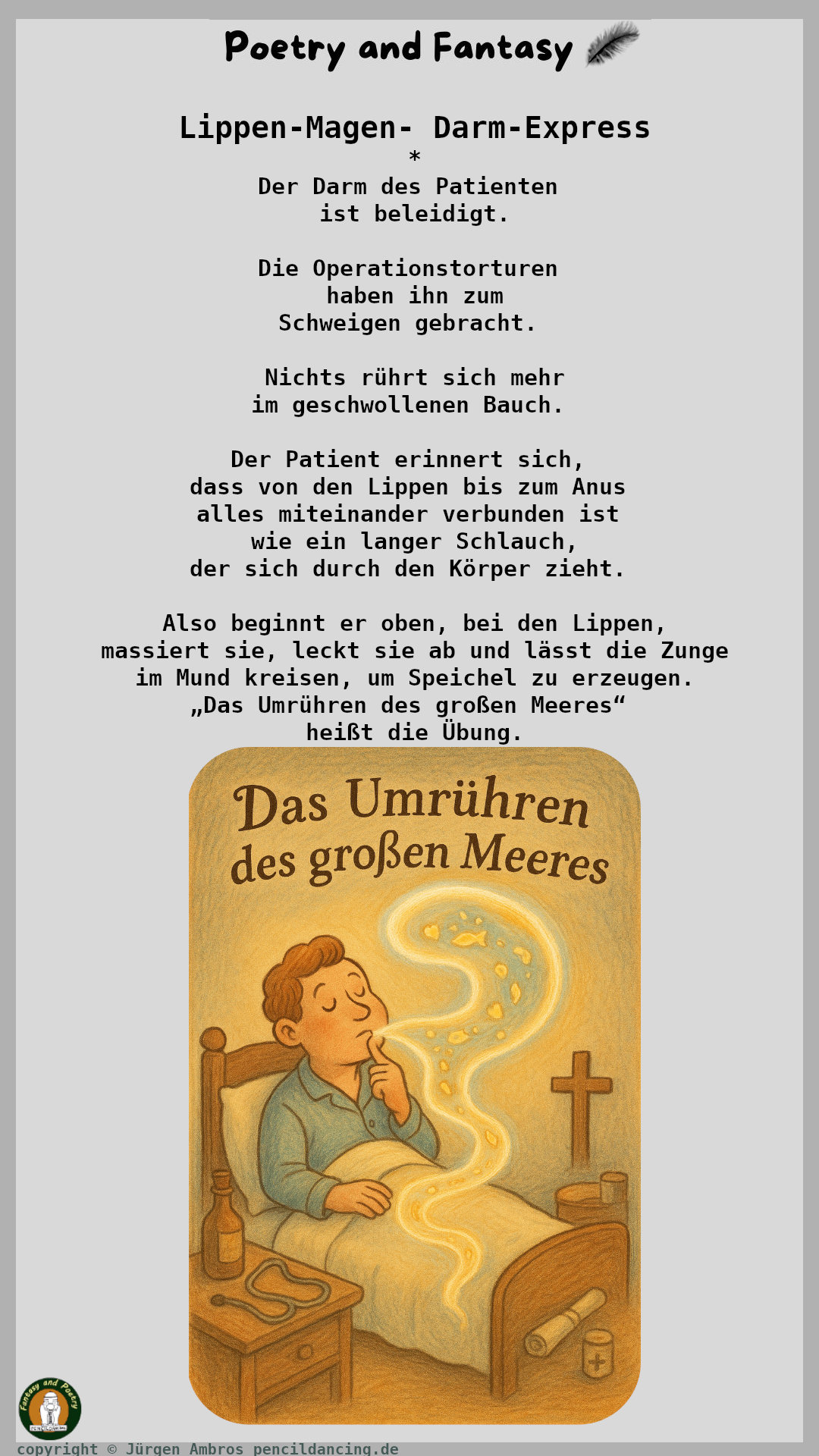 im geschwollenen Bauch. Der Patient erinnert sich, dass von den Lippen bis zum Anus alles miteinander