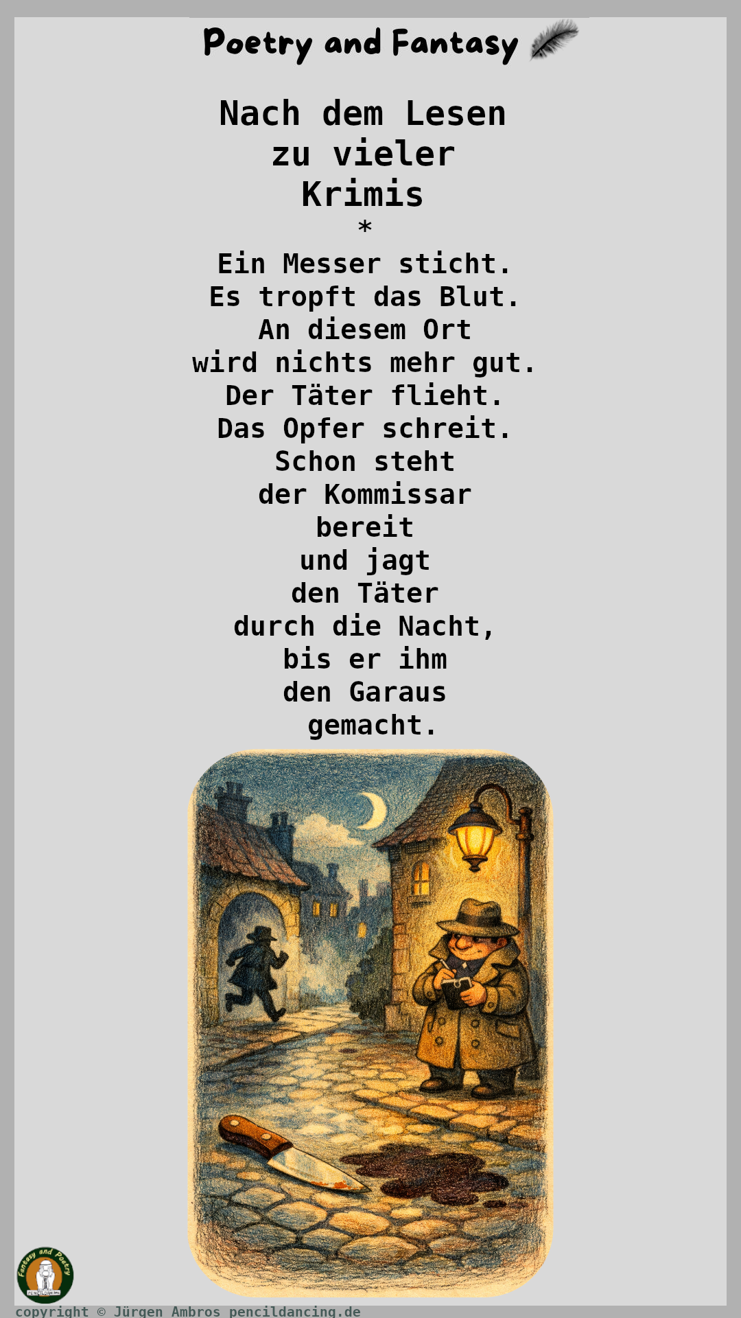 Nach dem Lesen zu vieler Krimis Veröffentlicht am Februar 12, 2026Februar 12, 2026 von Ambros Jürgen Nach dem Lesen zu vieler Krimis * Ein Messer sticht. Es tropft das Blut. An diesem Ort wird nichts mehr gut. Der Täter flieht. Das Opfer schreit. Schon steht der Kommissar bereit und jagt den Täter durch die Nacht, bis er ihm den Garaus gemacht. Veröffentlicht in Poetry.