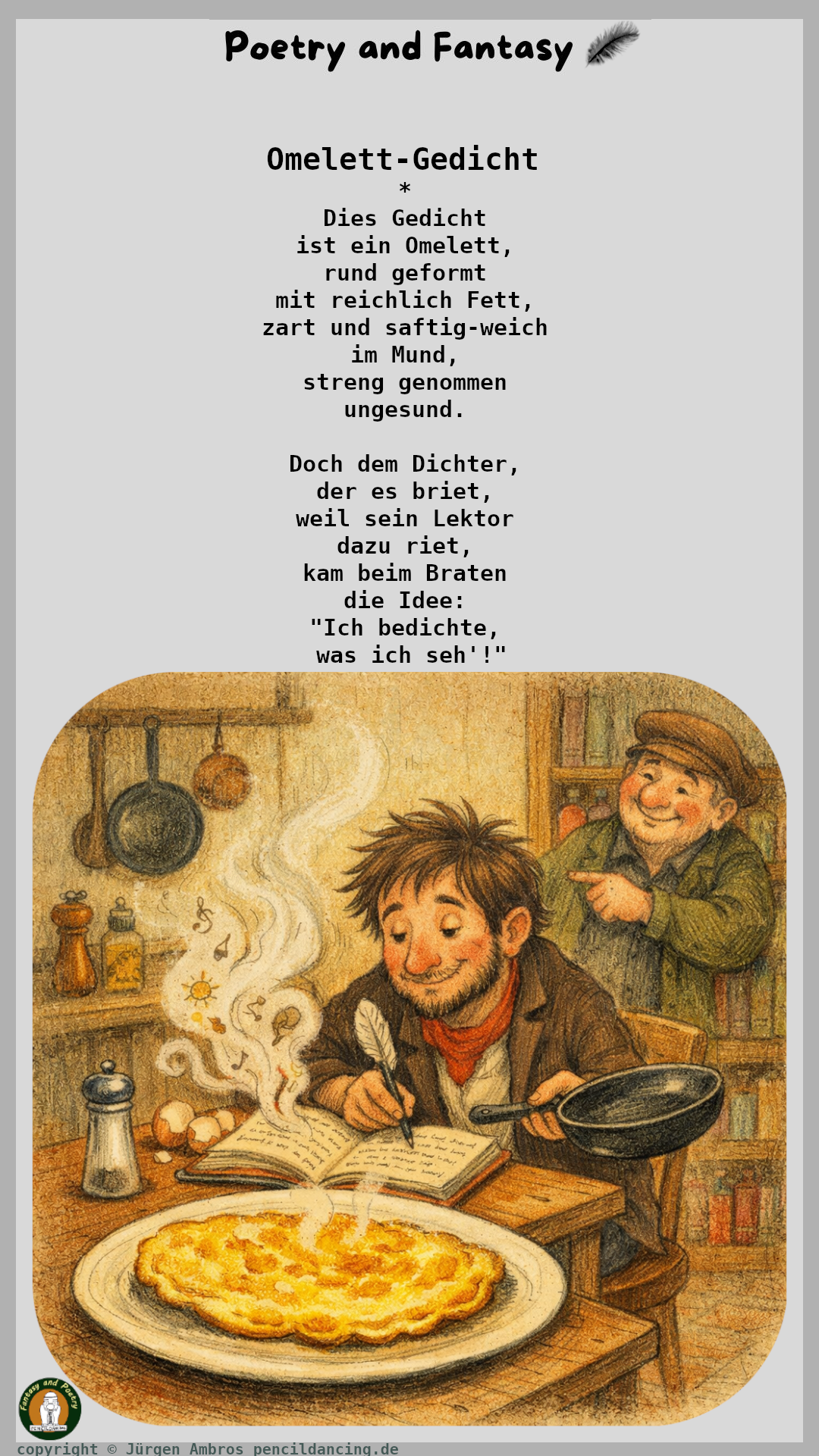 Omelett-Gedicht Veröffentlicht am Januar 8, 2026Januar 8, 2026 von Ambros Jürgen Omelett-Gedicht * Dies Gedicht ist ein Omelett, rund geformt mit reichlich Fett, zart und saftig-weich im Mund, streng genommen ungesund. Doch dem Dichter, der es briet, weil sein Lektor dazu riet, kam beim Braten die Idee: "Ich bedichte, was ich seh'!" Veröffentlicht in Poetry.